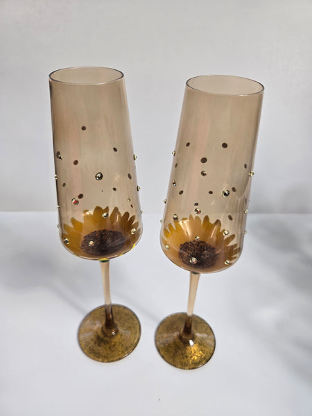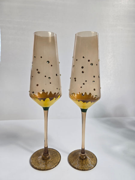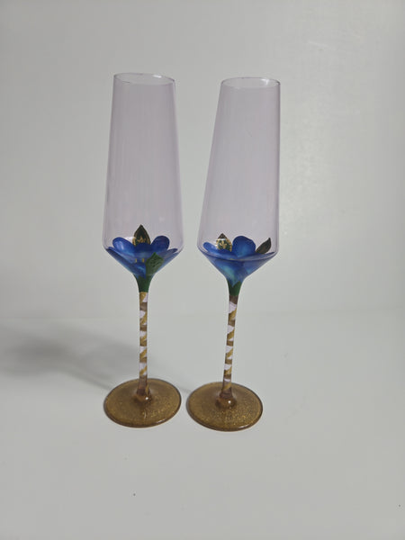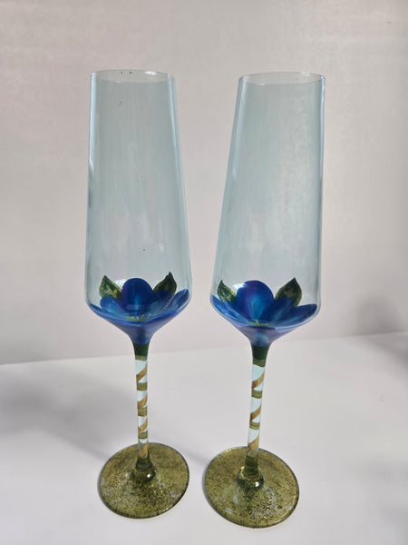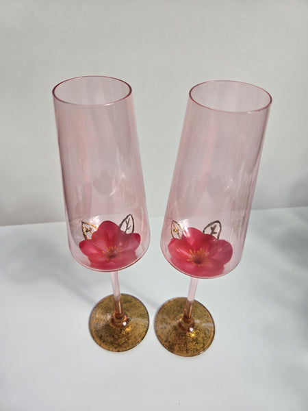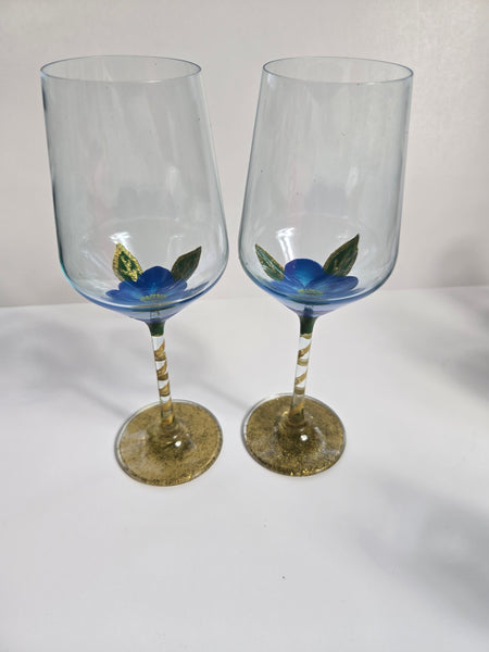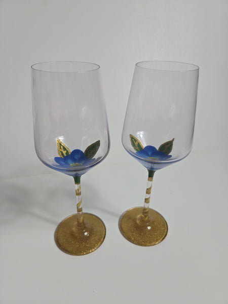 Elegant hand-painted flowers with golden leaves on tinted mouth-blown glassware. Champagne glasses set and wineglass set with blue or pink flower hand-painted with care. Enhance any kitchen table with a pop of functional art.